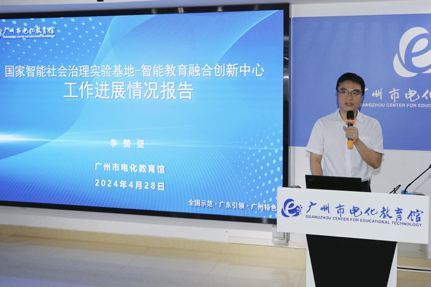 随后,广州市电化教育馆创新研究部李赞坚主任作《智能教育融合创新中心研究工作情况报告》,回顾了过去的研究工作进展,明确了各校研究方向,公布了支撑校数据交换标准及三个研究报告的框架,并提出了接下来工作团队将深入开展入校调查、定期组织开展数据上报空及指导协助各学校形成案例等工作安排。
